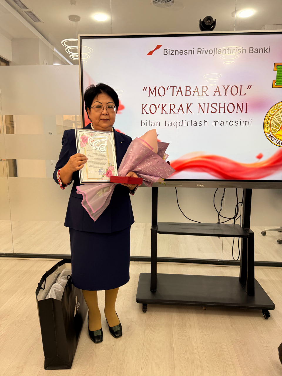 Bu boradagi islohotlarda faol ishtirokchi oʻlaroq “Biznesni rivojlantirish banki” ATB Qoraqalpogʻiston Respublikasi hududiy boshqarmasi bosh mutaxassisi Dina Kosbergenovaning “Moʻtabar ayol” koʻkrak nishoni bilan taqdirlangani alohida koʻrsatib oʻtildi. Mutaxassisga shuningdek, Bank boshqaruvi raisining ham tashakkurnoma va esdalik sovgʻalari topshirildi.