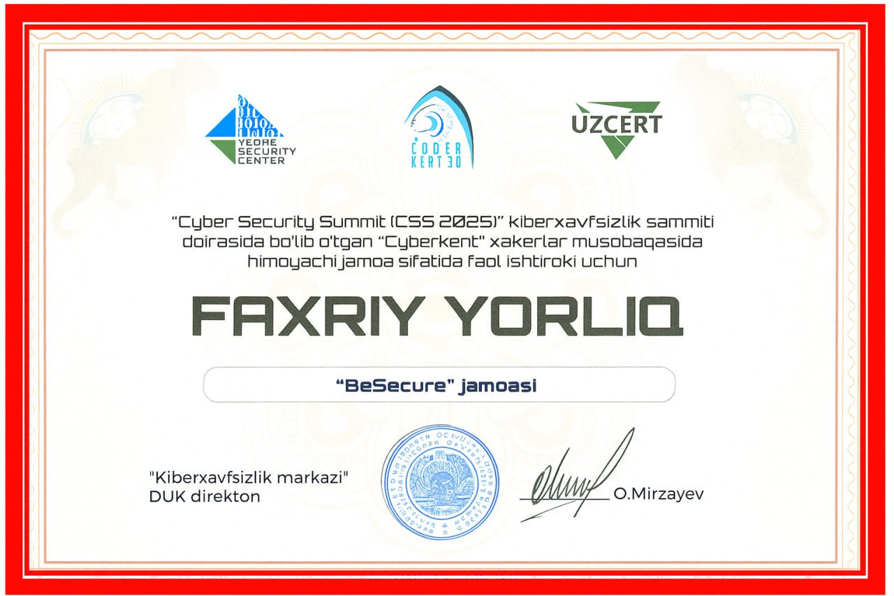 Faxr bilan aytish mumkinki, ushbu nufuzli musobaqada bankimiz vakillari – Ismoilbek Mamajanov, Farhod Turg‘unboyev, Akram Axmedov, Bobur Xamzakulov va Mirkomil Abduraimovlardan iborat “BeSecure” jamoasi ishtirok etib, saralangan eng yaxshi 10 ta jamoa qatoriga kirishga muvaffaq bo‘ldi. Final bosqichida ham ular yuqori faollik va professionallik namunasini ko‘rsatdilar.