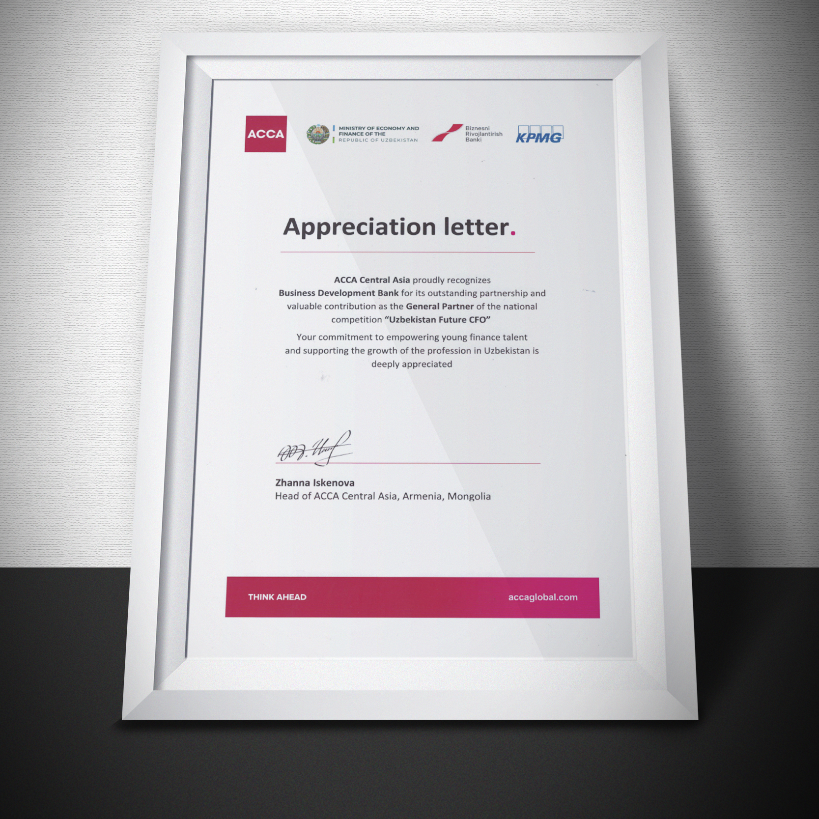 ACCA Markaziy Osiyo rasmiylari o‘z navbatida, “O‘zbekistonning bo‘lajak moliyaviy direktor” milliy tanlovining Bosh hamkori sifatida faol ishtiroki va beqiyos hissasi uchun “Biznesni rivojlantirish banki”ga alohida minnatdorlik bildirib, maxsus sertifikat taqdim etdi.