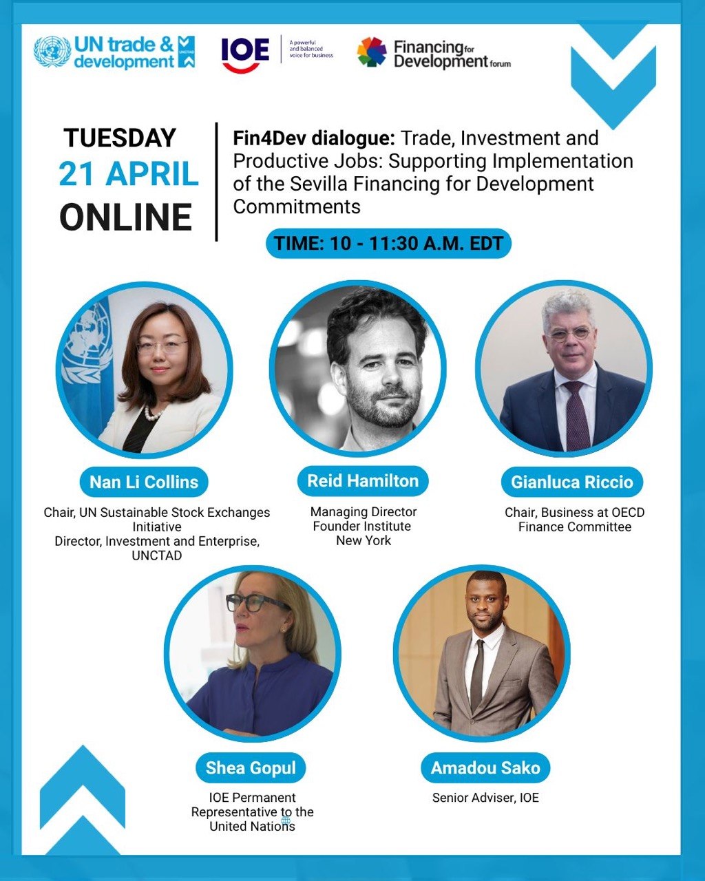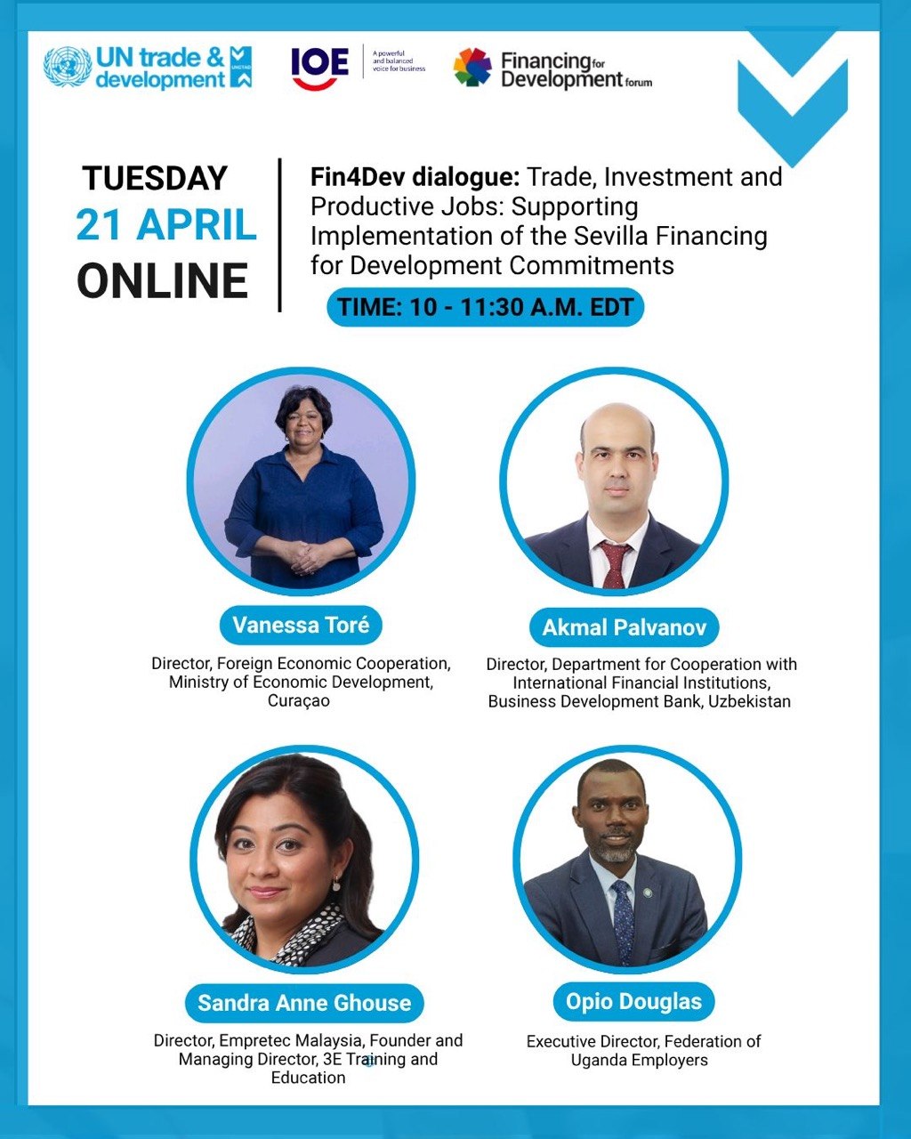 “Savdo, investitsiyalar va samarali ish o‘rinlari: rivojlanishni moliyalashtirish bo‘yicha Sevilya majburiyatlarini amalga oshirishni qo‘llab-quvvatlash” nomli davra suhbati YUNKTAD (UNCTAD), Xalqaro ish beruvchilar tashkiloti (IOE), Iqtisodiy hamkorlik va taraqqiyot tashkiloti (IHTT/OECD), shuningdek, BMTga a’zo davlatlar va xalqaro tadbirkorlik ekotizimlari vakillari ishtirokida tashkil etildi.