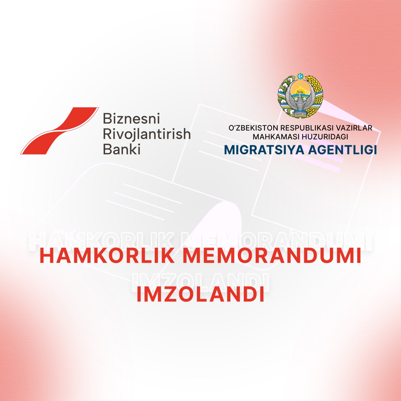 O‘zbekiston Respublikasi Prezidenti rahbarligida 2024-yil 16-dekabr kuni o‘tkazilgan videoselektor yig‘ilishida mahallalarda aholi bandligini ta’minlash va daromadli ish o‘rinlarini yaratish bo‘yicha berilgan topshiriqlar ijrosi doirasida, bank Vazirlar Mahkamasi huzuridagi Migratsiya agentligi bilan hamkorlikda Farg‘ona va Andijon viloyatlarida xalqaro sertifikat beruvchi o‘quv markazlarini tashkil etish bo‘yicha Hamkorlik memorandumini imzoladi.